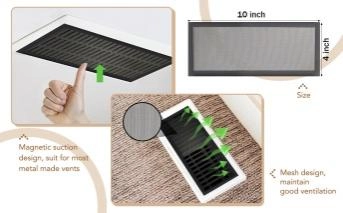 The vent mesh is designed to catch more debris while having good air ventilation. Moreover, it can prevent small items like keys, jewelry, cookies and more from falling down the duct run. The vent cover mesh adopts a magnetic frame design with a rectangle shape, which is easy to firmly attach the metal surface with a click the floor register screen will be a helper in summer, which can help you to keep out of spiders, small moths or other unwanted insects.